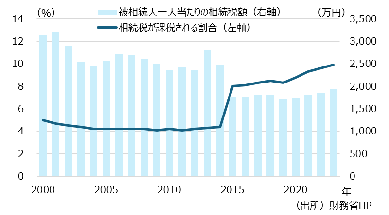 この改正により、それまでであれば相続財産が少なくて課税されなかった層でも、一部は相続税が課されるようになったため、相続税が課税される割合が上昇しました。一方、被相続人一人当たりの相続税額は、相対的に課税額が少ない層が増えたことで減少したと考えられます。