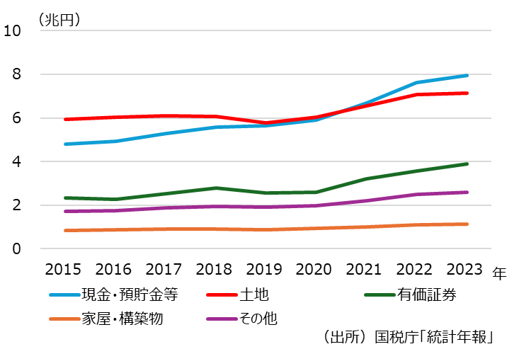 また、ここ数年の動向をみると、相続税が課税される割合が更に上昇しており、足もとでは約10%、つまり10人に1人の割合で相続税が課税されていることがわかります。この背景を探るため、相続財産の中身について見てみます。