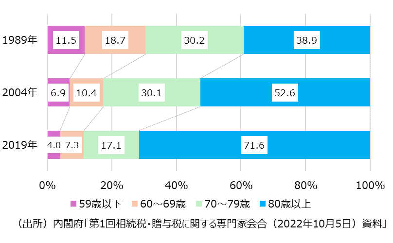 では次に、相続人の特徴を見てみます。図3は、被相続人の年齢構成です。平均寿命が延びている中で被相続人の高齢化が進んでおり、近年では80歳以上の割合が7割を超えています。これに伴い相続人の高齢化も進んでいると考えられます。被相続人が80歳以上となると、相続人は50歳を超えるケースが多いのではないでしょうか。