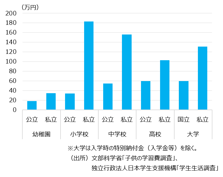 図4 学校ごとの年間教育費 幼稚園~高校(2023年度)大学(2022年度)