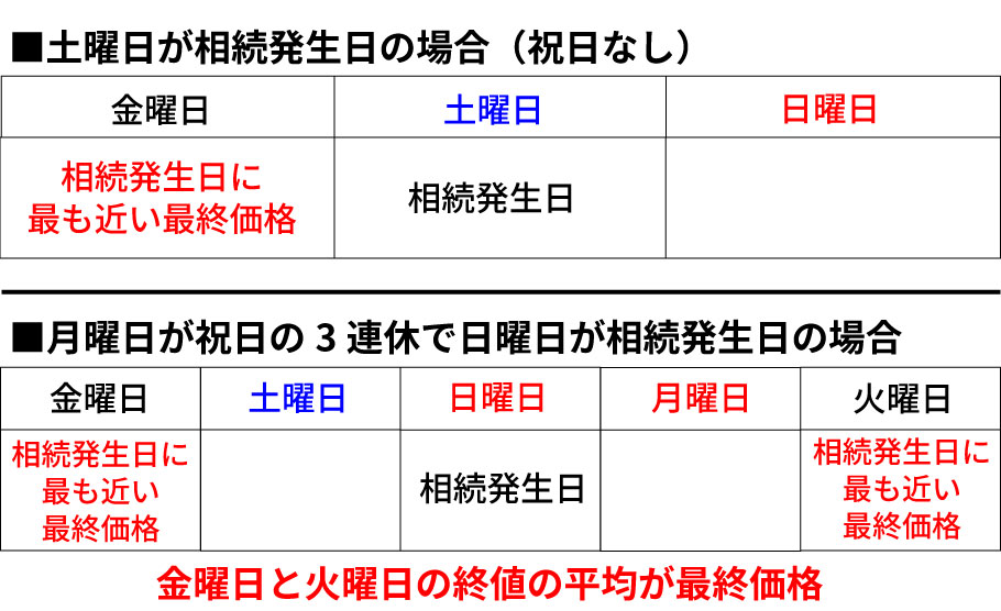 例えば、相続発生日が土曜日の場合は金曜日の最終価格となります。月曜日が祝日で3連休の中日である日曜日に相続が発生した場合は、金曜日と火曜日の終値の平均を最終価格とします。