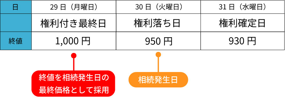 例えば、30日が権利落ち日で亡くなった日でもある場合、29日の終値を相続発生日の最終価格として採用します。
