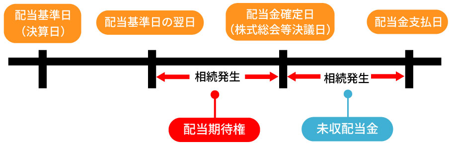 配当基準日の翌日から配当確定日までに死亡した場合は「配当期待権」、配当確定日の翌日から受取日までの間に死亡した場合は「未収配当金」として相続財産に含めます。