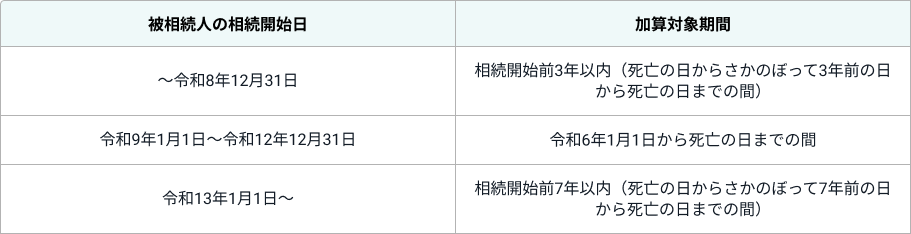 亡くなる直前に、受けた贈与は相続財産に持ち戻さなくてはいけません。これまでは亡くなる3年前の贈与を持ち戻す必要があったのですが、2023年の税制改正により、2024年の1月1日から新たに行う贈与について持ち戻しの期間が段階的に延び、最終的に亡くなる7年前の贈与まで相続財産に持ち戻すことになりました。