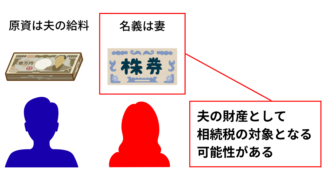 専業主婦の妻が本人名義の証券口座を開設し、夫の給料の一部を使って株式を購入し保有していた場合、「妻名義の株式」は夫の名義株式に該当します。