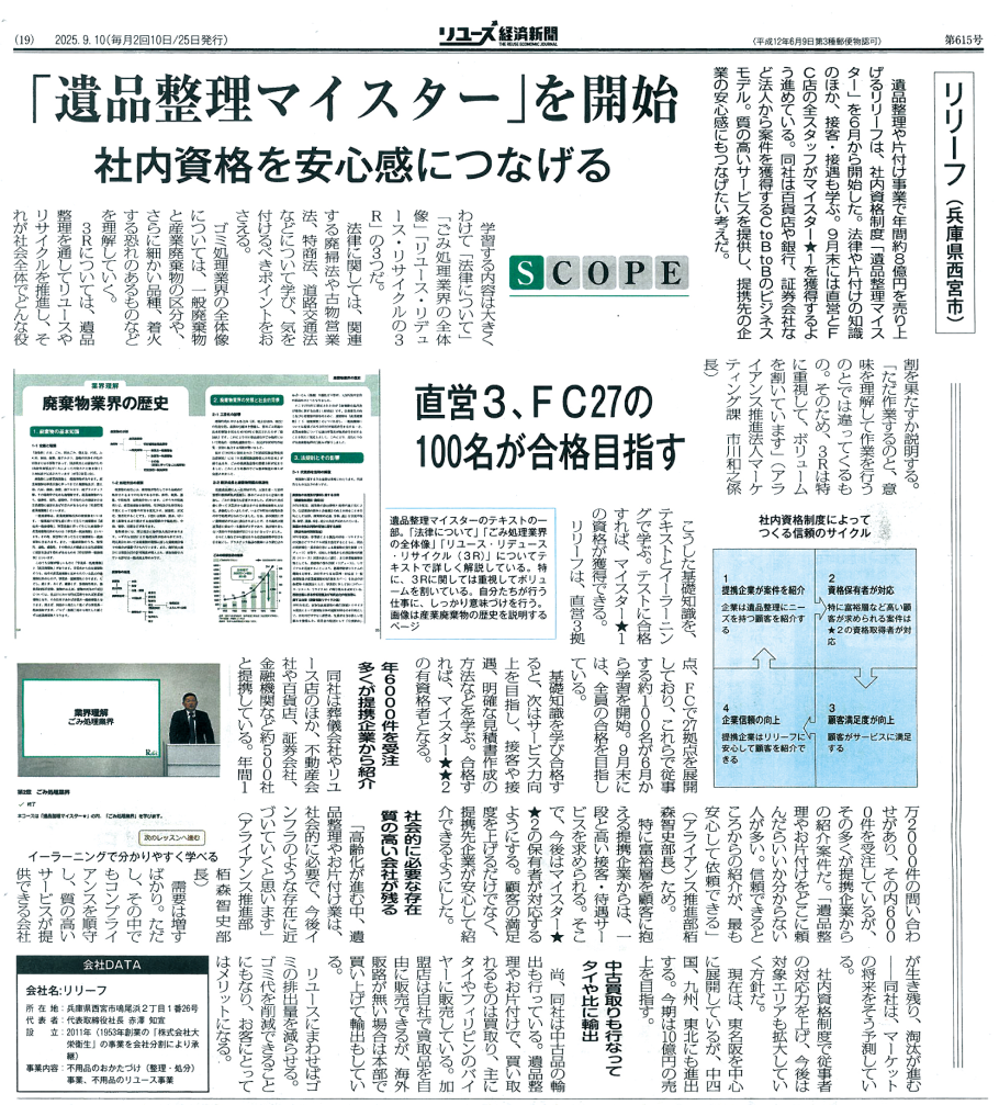 2025年9月13日発行の『リユース経済新聞』では、リリーフの「遺品整理マイスター」制度が詳しく紹介されました。