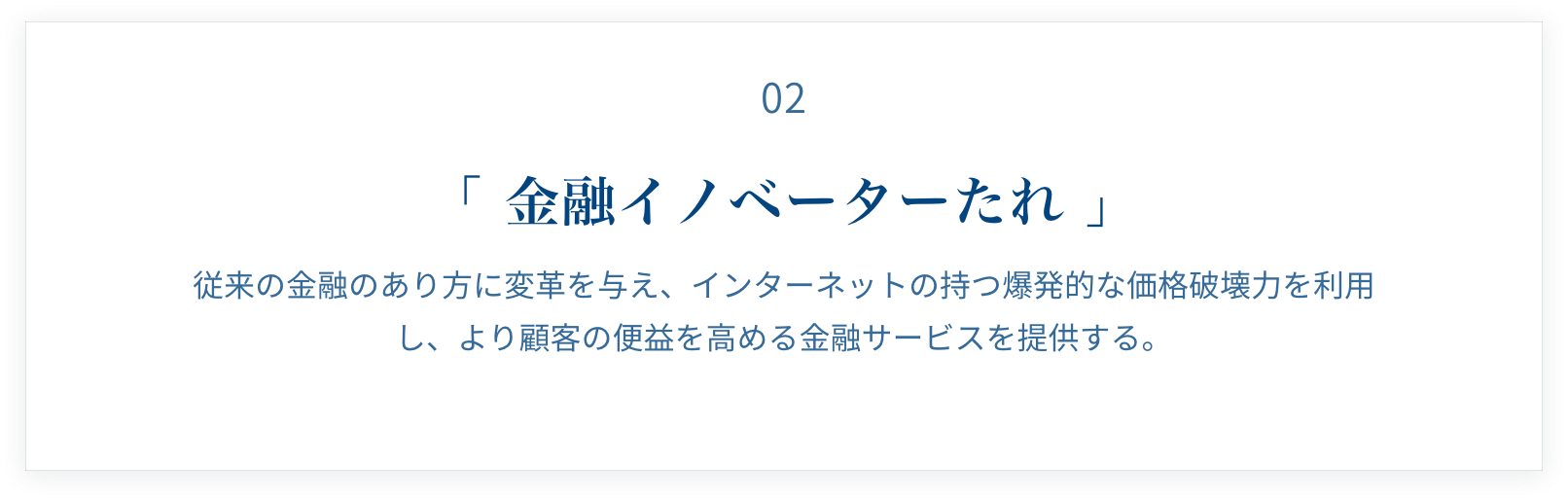 当社は、「インターネット革命」と「金融の規制緩和」の大きな時代の潮流の中、『顧客中心主義』の経営理念のもと、お客様本位のさまざまな金融サービスを提供し続けてきたことで、オンライン証券でNo.1の地位を築きあげました。