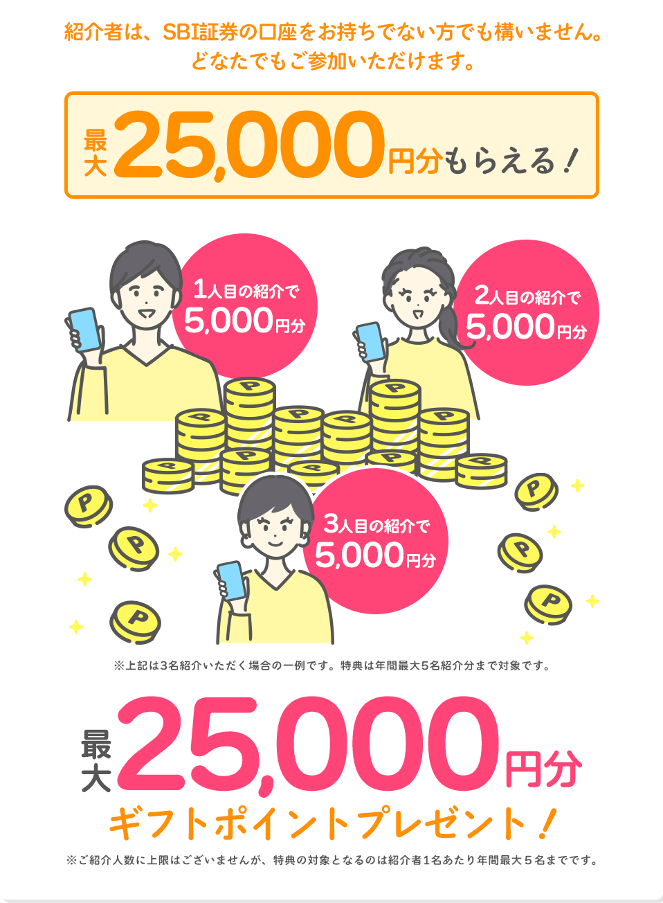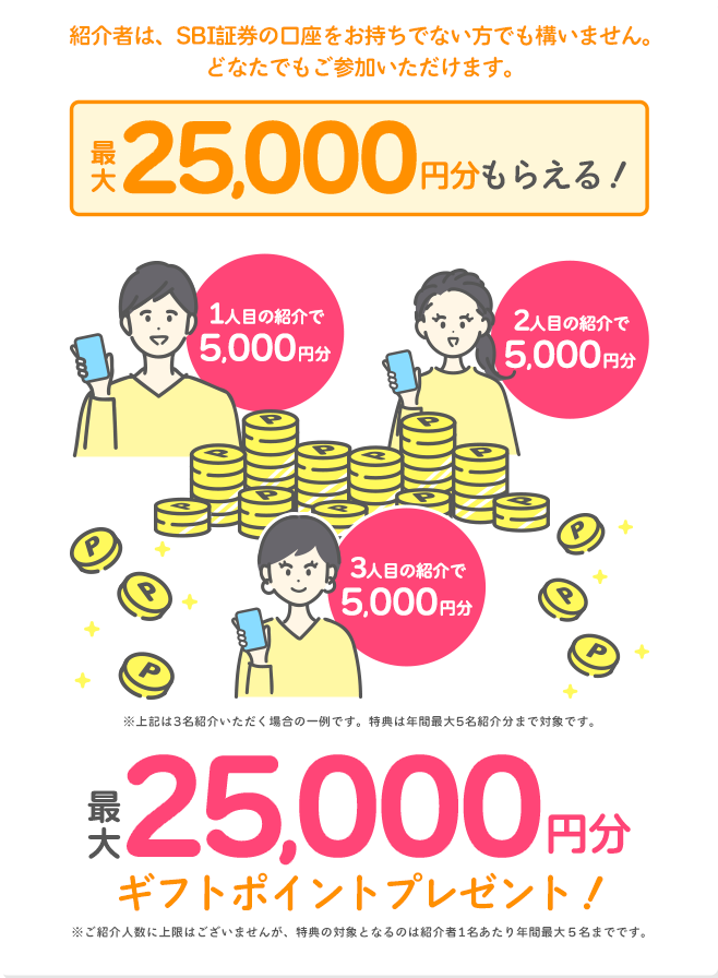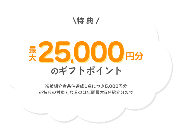 紹介いただく人数に上限はございませんが、ポイント対象となるのは最大5名まで(=ギフトポイント25,000ポイント)です。