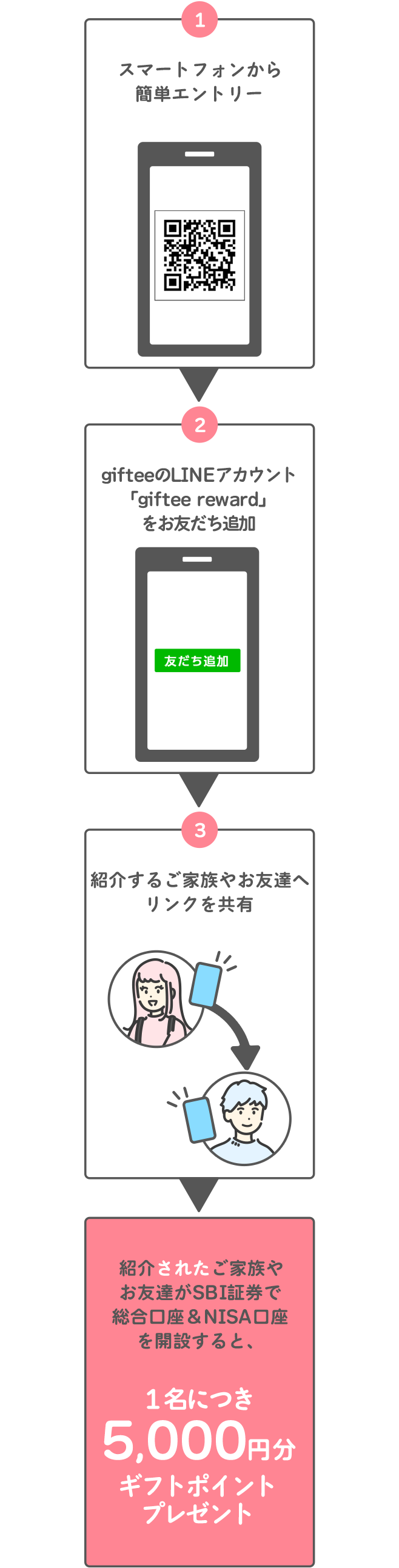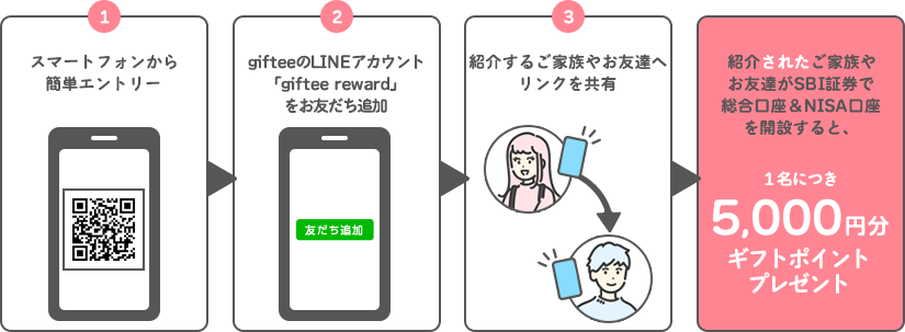 以下のすべての条件を満たすこと ①専⽤LINEアカウント(giftee reward)よりご家族やお友達(被紹介者)を紹介すること ※NISA口座開設完了は、弊社からの「重要なお知らせ」にて「【重要】NISA口座開設審査完了のお知らせ」のお受取りをもっての完了となります。NISA口座開設には2週間ほど時間がかかりますので、お早めにお手続きください。 |