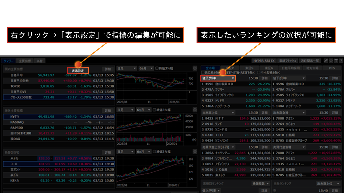 マーケット画面の指標(国内主要指標/海外主要指標/為替)、各種ランキングのカスタマイズが可能になりました。