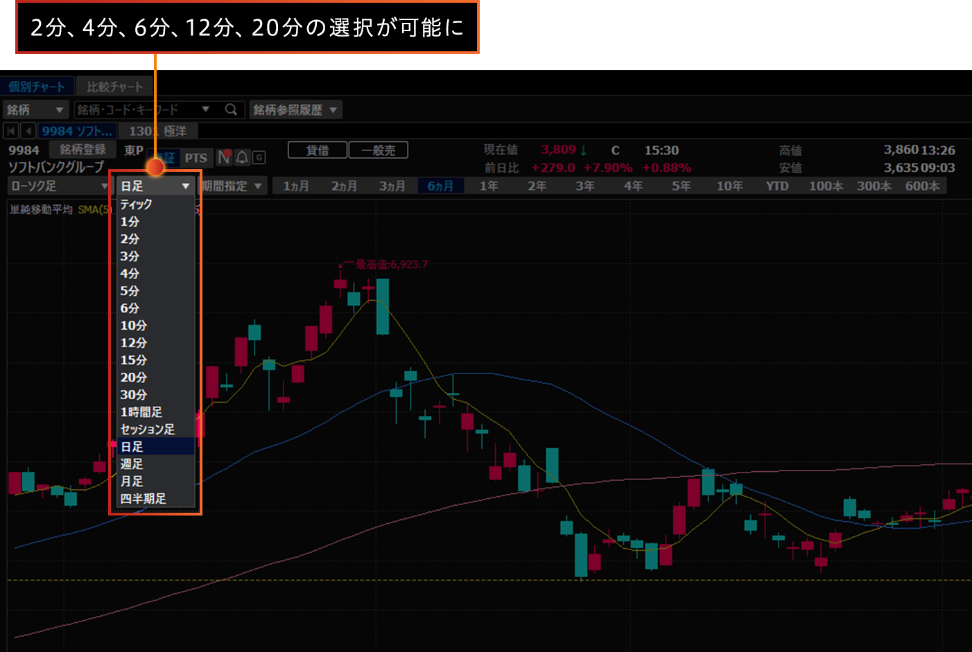 個別チャート、ミニチャートの分足(2分、4分、6分、12分、20分)が追加になりました。