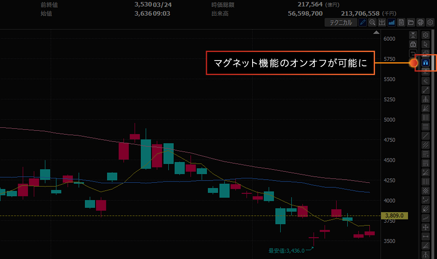 個別チャート画面でライン描画時にマグネット機能オンオフ切り替えが可能になりました。