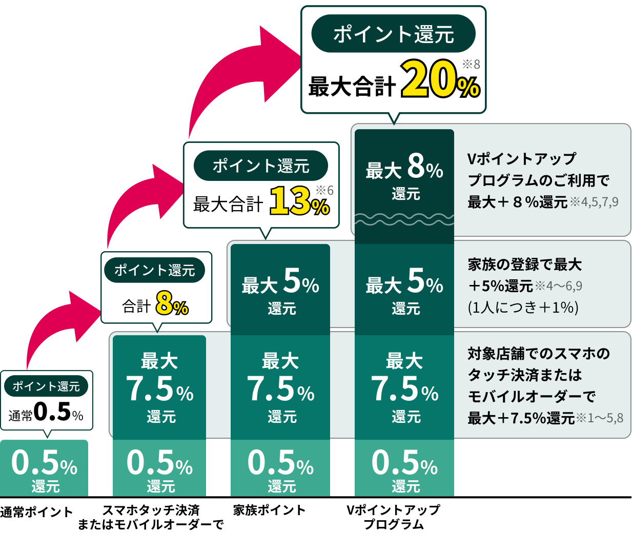 ポイント還元率の合算は、複数のVポイントアッププログラムの条件を達成した場合、20%を超える事がございますが、景品表示法の定めに基づき、実際にポイントアップされる還元率の上限は20%までとなります。