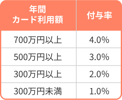 100万円のご利用ごとに10,000ポイントを付与します(最大40,000ポイントまで)。