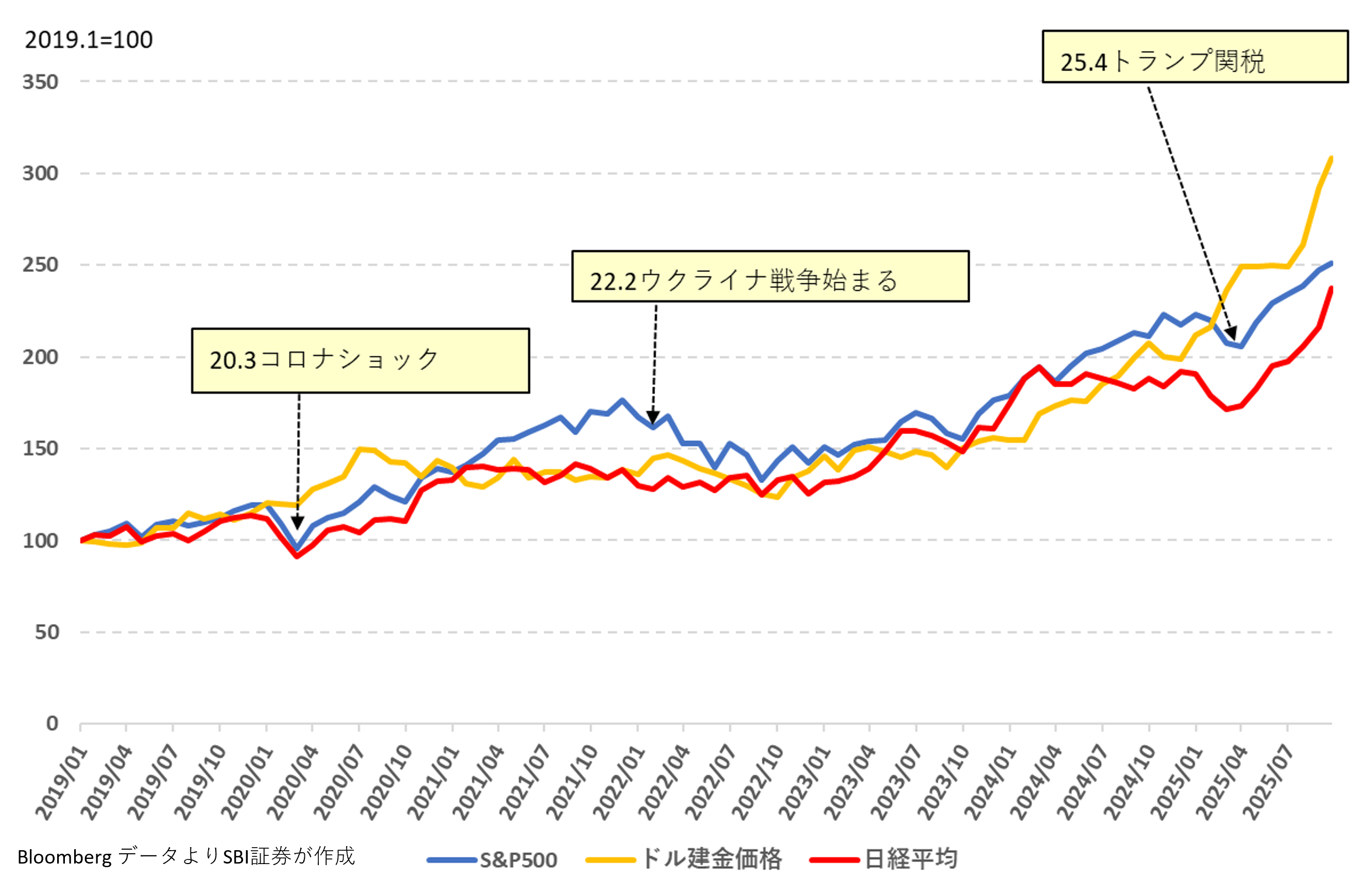 図表1 コロナ前年からの日米株とドル建金価格の推移