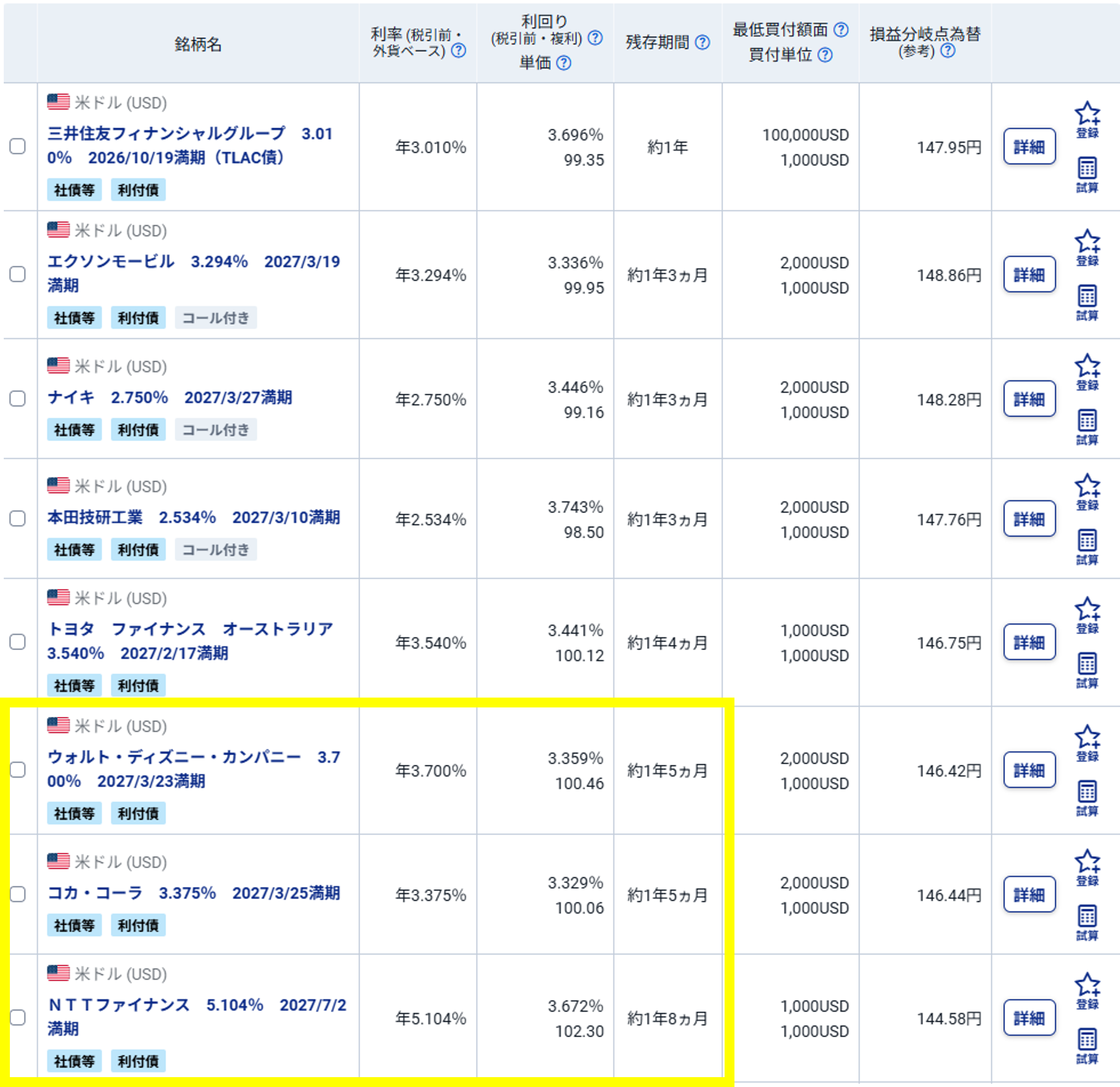 →この操作で、対象の銘柄が113件になり、残存期間が短い順に並びました(2025年10月27日時点、図表4参照)。黄色でハイライトした3銘柄(ウォルト・ディズニー・カンパニー、コカ・コーラ、NTTファイナンス)がちょうど1年5カ月~8カ月の残存期間で今回の目的に合っていると考えられます。