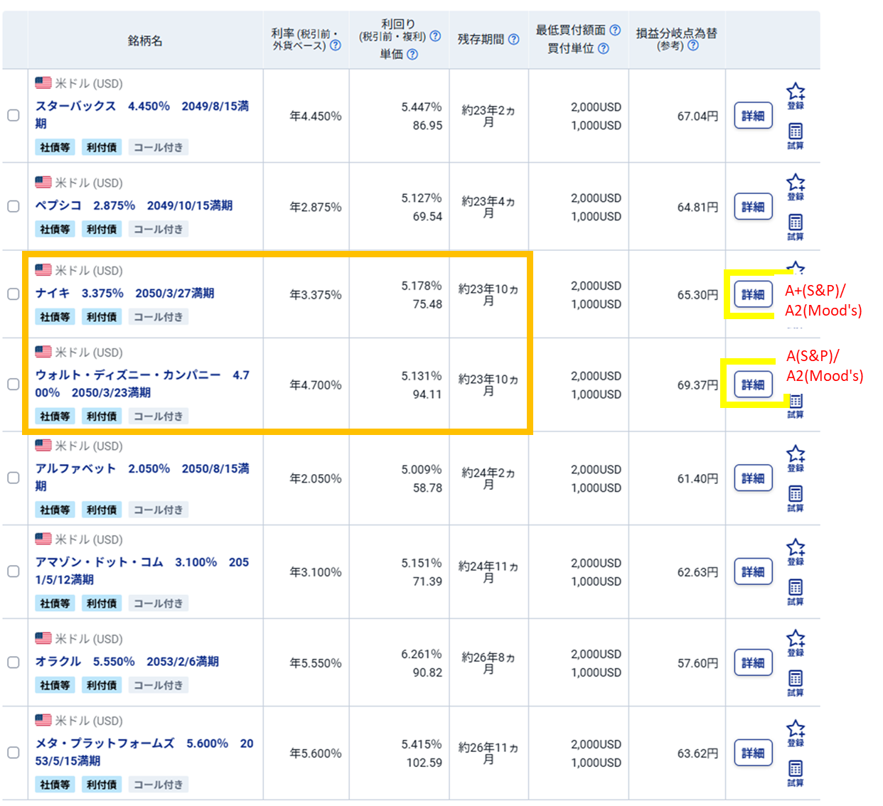 最低買付額面が2,000USDとそれほど大きくないので、例えば10,000USDなら5銘柄といった具合に分散投資するとよいでしょう。なお、下記の例で残存期間約23年10カ月の銘柄にナイキとウォルト・ディズニー・カンパニーがありますが(オレンジ枠)、購入前には必ず「詳細」(黄色枠)をクリックして、それぞれの格付けを確認しましょう。