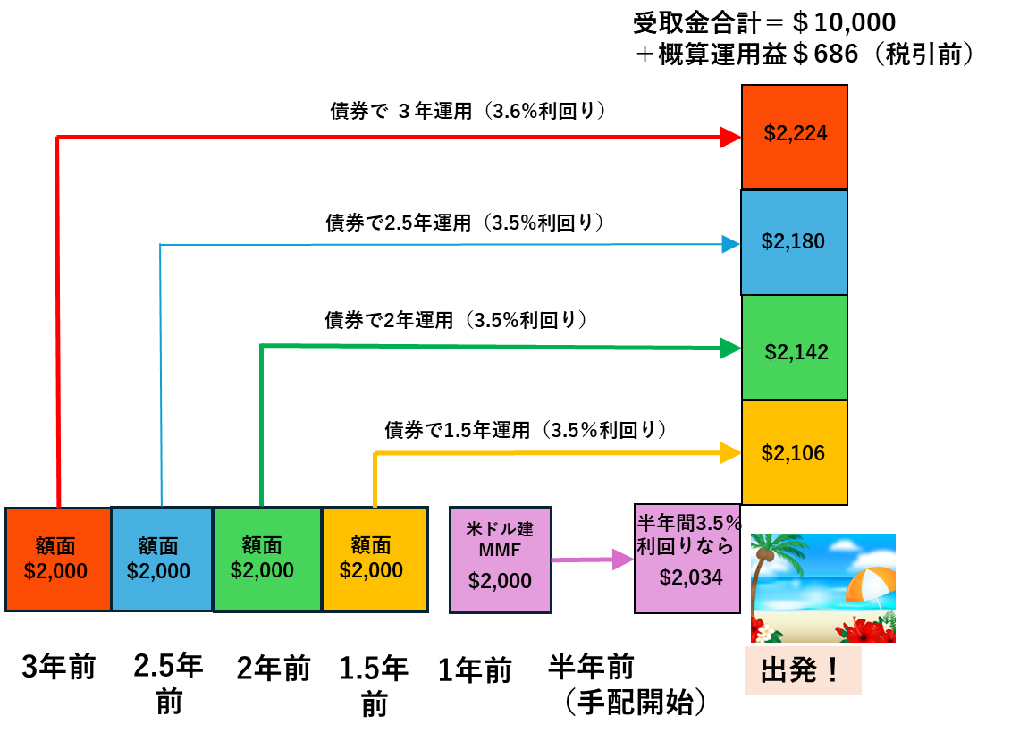 これで出発の1年前には1万ドルの資金が準備でき、3年間は債券と米ドル建MMFでしっかり運用できます。