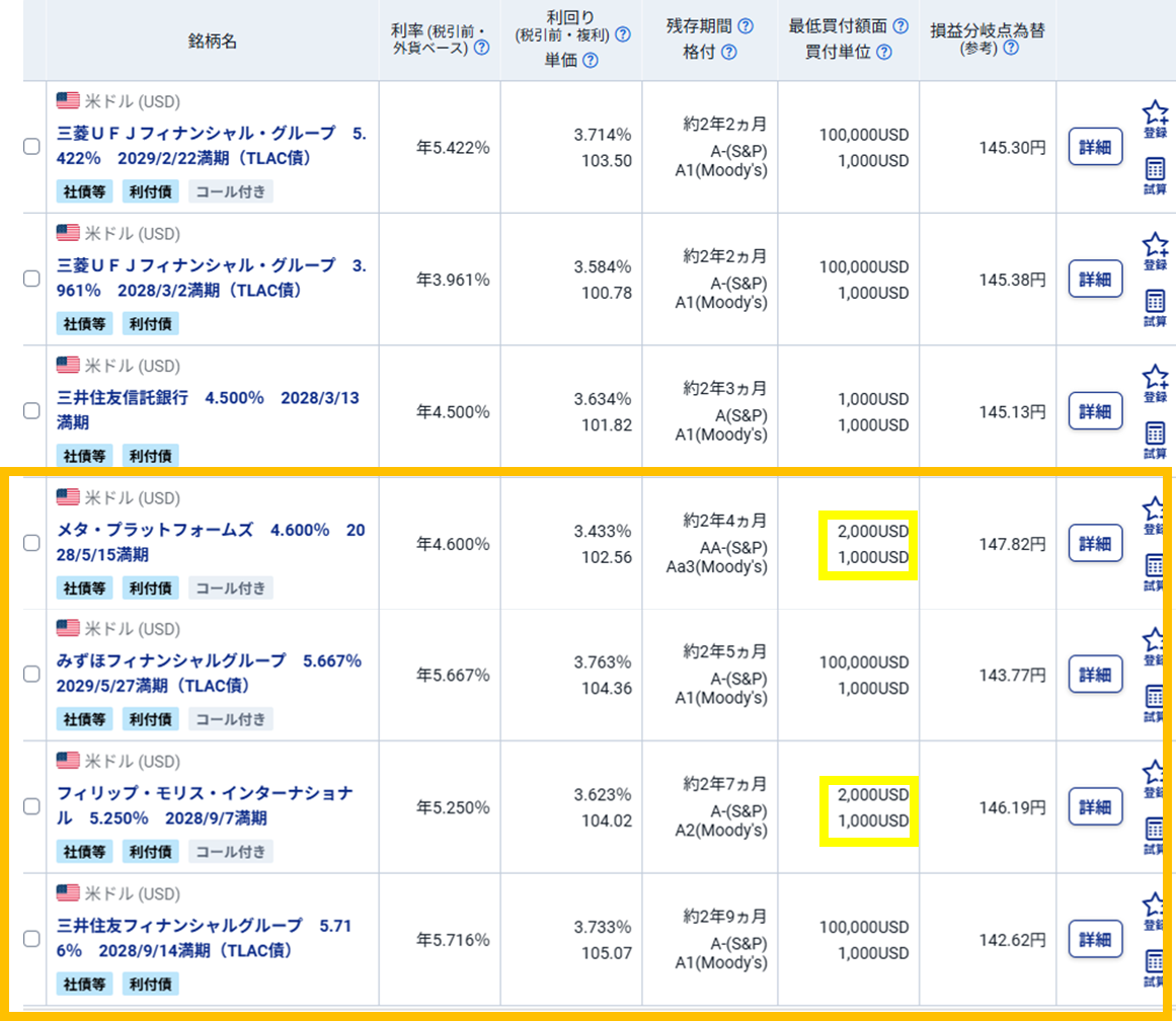 残存期間が3年に近い4銘柄のうち、メタ・プラットフォームズ(残存期間2年4カ月)とフィリップ・モリス・インターナショナル(残存期間2年7カ月)の最低買付額面が2,000ドルなので、今回の旅行資金積立の目的に合っているといえます。旅行開始前に償還された資金は、米ドル建MMFで運用しながら旅行開始前の支出に充当していくとよいでしょう。