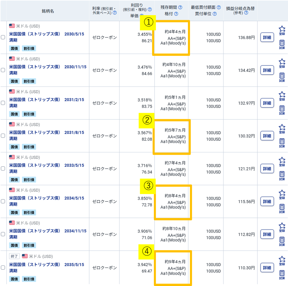 まず残存期間が4年に近い銘柄を探すことにします。①が4年4カ月なので、これが該当します。残存期間6年に近い銘柄には②の5年7カ月を用います。このように概ね目指す残存期間であれば良しとして進めるのが現実的です。③は残存期間8年4カ月なので、8年の残存期間の銘柄とします。10年に相当する銘柄は近いものが無かったので④の9年4カ月の残存期間の銘柄を用います。あとは検索条件の残存期間を切り替えて、希望に近い銘柄を探すことでラダー戦略を実践することができます。