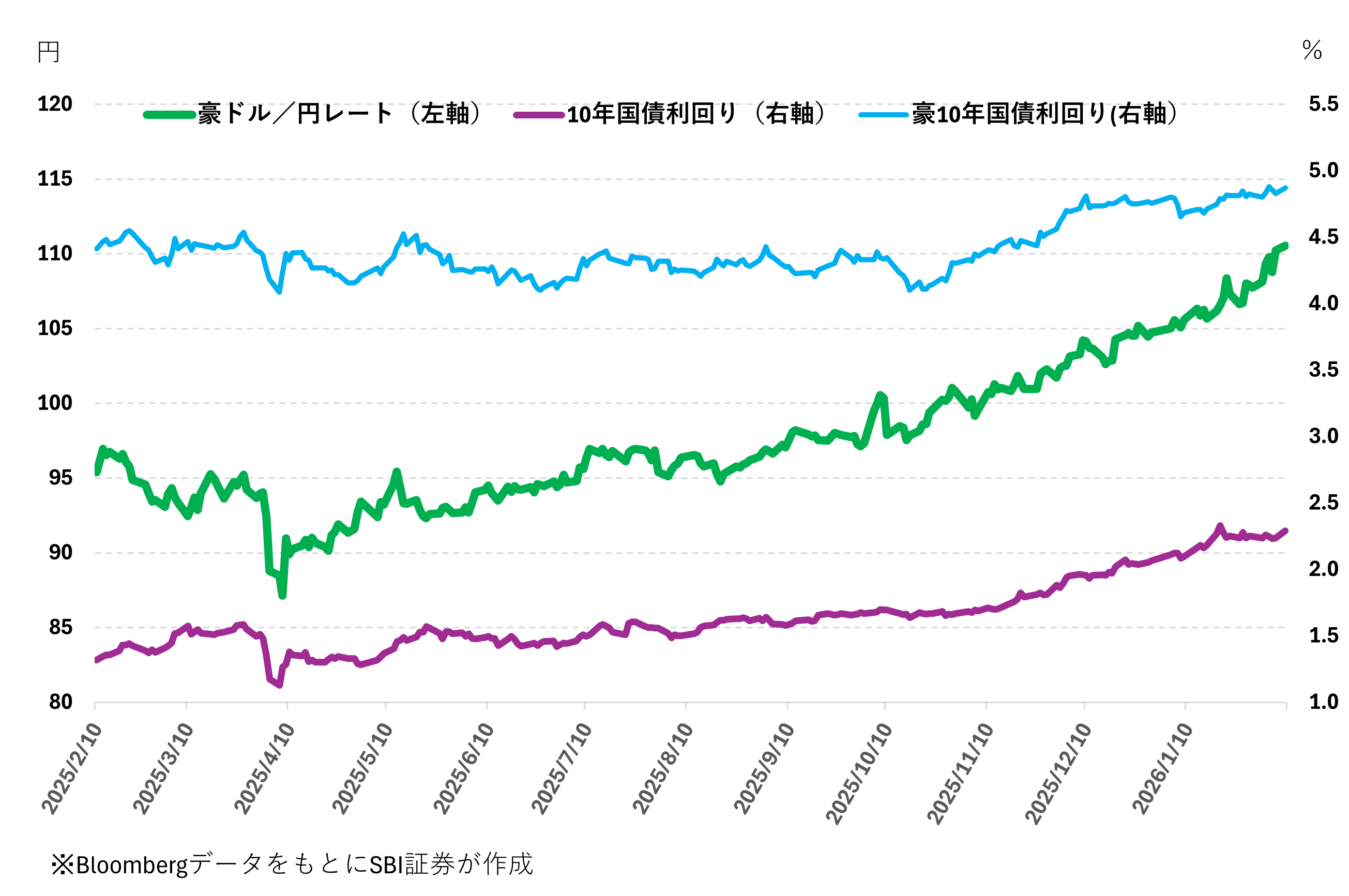 2026年1月の為替協調介入懸念から円高・米ドル安方向に相場が動いた際に、ユーロ円、豪ドル/円レートも若干円高方向に動きましたが、その後、ともに円に対して強含みとなり、特に豪ドル高・円安が進んでいます。