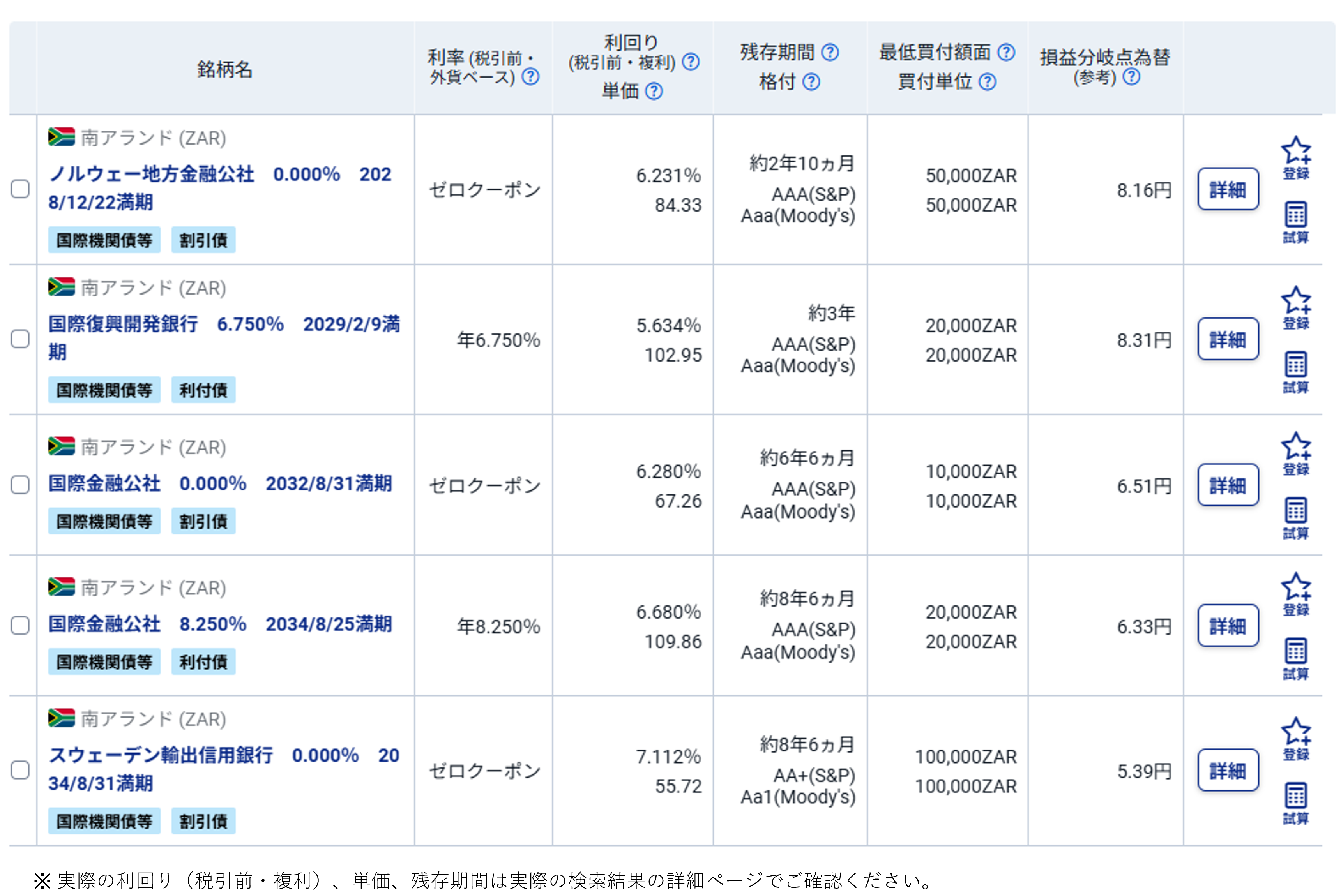 SBI証券で南アフリカランド建の既発債を探してみましょう。