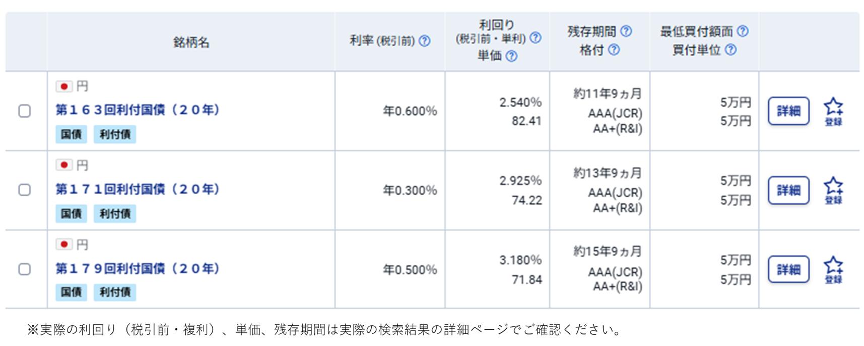 SBI証券で取り扱っている債券の銘柄や条件は、日々変わります。購入前には、必ず最新情報をWEBサイトで確認してください。