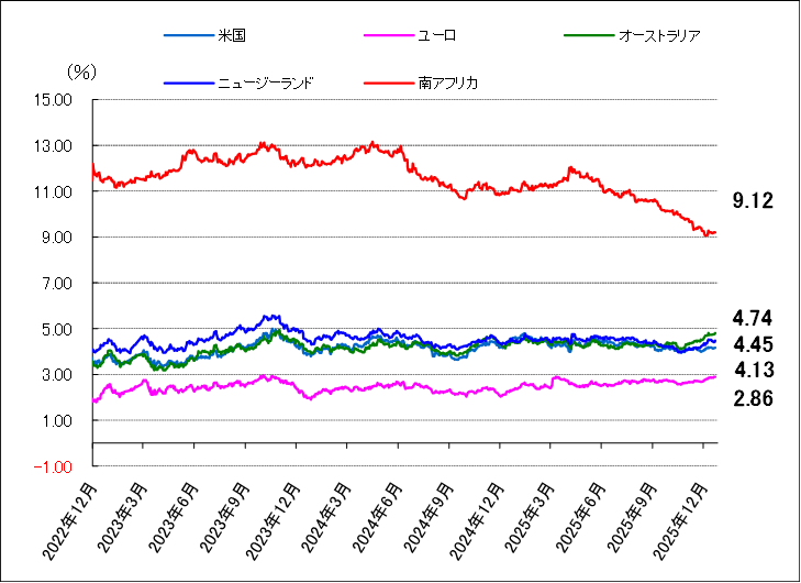 ランド・円は下落した。週前半は、南アの主要産品である金価格の上昇を材料に底堅く推移したが、片山さつき財務相が円相場について「投機的」と述べたことや、一部のインタビューで為替介入を辞さない姿勢を示したことから円買いが優勢となり、上値が重くなった。週半ばに韓国の通貨当局による為替介入も警戒され、韓国ウォンが買われると、アジア通貨の動きに連動して円買いが加速、ランドに対しても円高が進んだが、週末は東京都区部の12月CPI(消費者物価指数)の鈍化や、26年度政府予算案の閣議決定などを材料に円売りが優勢となった。