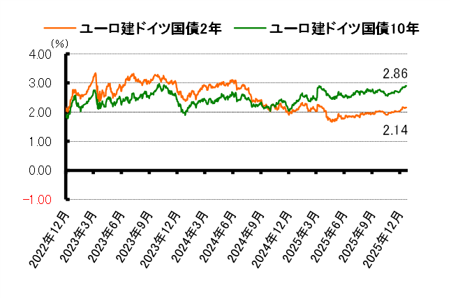 短期債利回り、長期債利回りともに低下した。シュナーベルECB(欧州中央銀行)理事が当面ECBは利上げを予想していないとの考えを示したことから、利回りは上昇した。ユーロ建て独2年債利回りは前週末の2.15%から2.14%に低下、ユーロ建て独10年債利回りも前週末の2.90%から2.86%に低下して越週した。