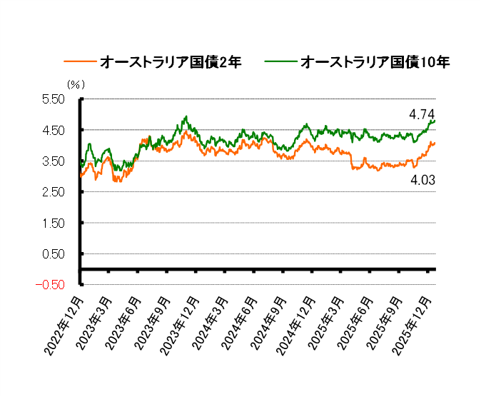 短期債利回りは横ばいとなった一方、長期債利回りは低下した。豪ドル建て2年債利回りは前週末の4.03%から横ばい、豪ドル建て10年債利回りは前週末の4.75%から4.74%に低下して越週した。
