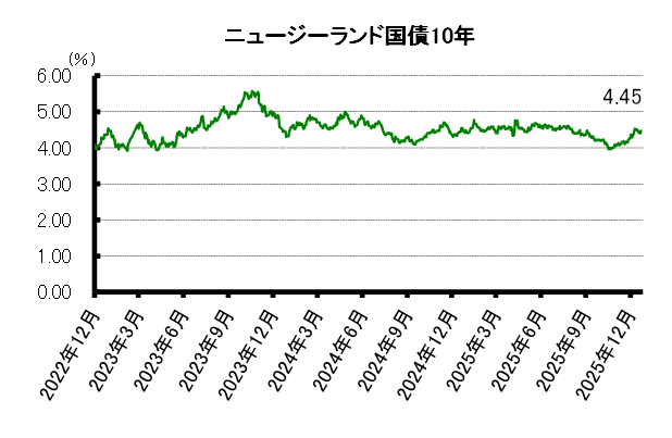 長期債利回りは上昇した。NZ債は弱含みでもみ合う展開。NZドル建て10年債利回りは前週末の4.40%から4.45%に上昇し、越週した。