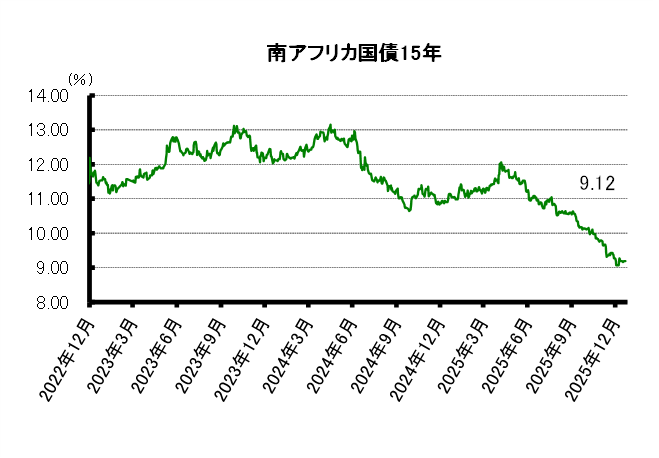 長期債利回りは低下した。手掛かり材料難に加え、週後半は25日のクリスマス、26日の親善の日で休場となるため、方向感は乏しかったが、南ア株高などを背景にリスクオンの債券買いがやや優勢となった。南アランド建て15年債利回りは前週末の9.19%から9.12%に低下して越週した。