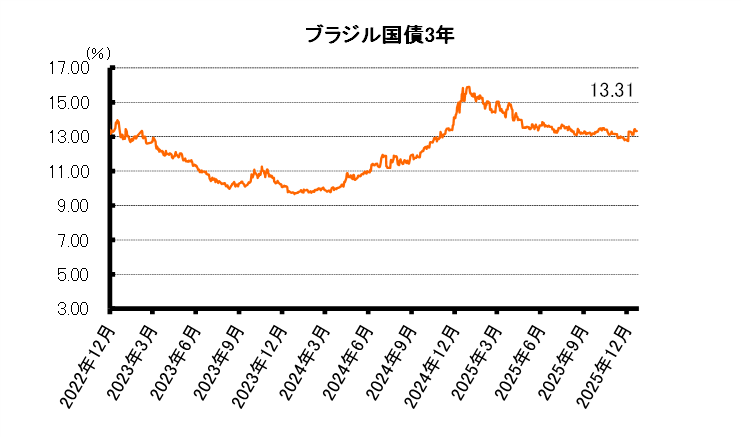 短期債利回りは低下した。26年の次期大統領選挙で、フラビオ氏の出馬の可能性が高まったことから、ブラジル債券は買われた、ブラジルレアル建て3年債利回りは前週末の13.33%から13.31%に低下して越週した。