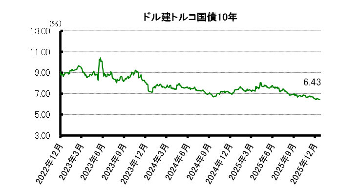 長期債利回りは低下した。低調なトルコ経済指標もありトルコ債券は一時売られる場面も見られたが、週後半に米金利が低下基調となりトルコ金利も連動して低下した。ドル建てトルコ10年債利回りは前週末の6.44%から6.43%に低下して越週した。