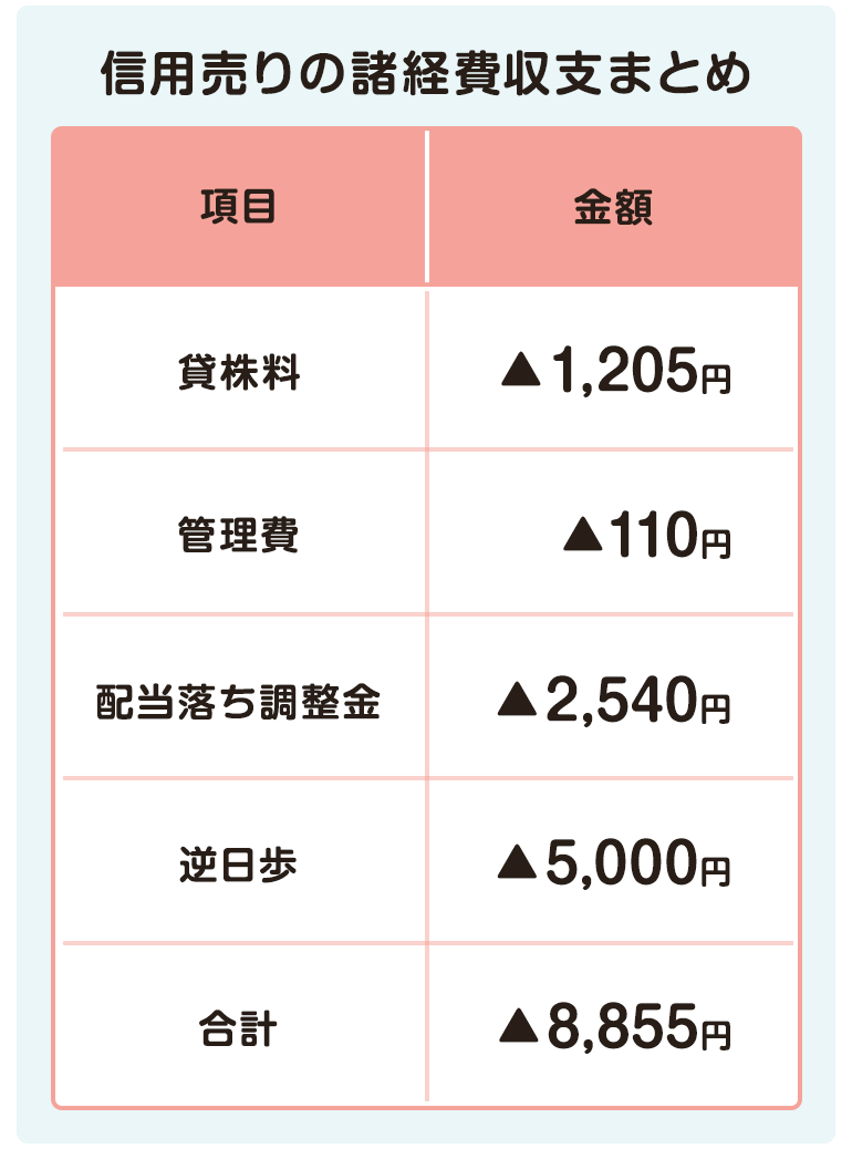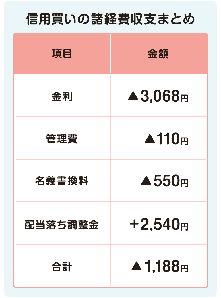 かかる費用は、保有期間に応じた信用金利、保有1ヵ月経過でかかる管理費、権利またぎで発生する名義書換料