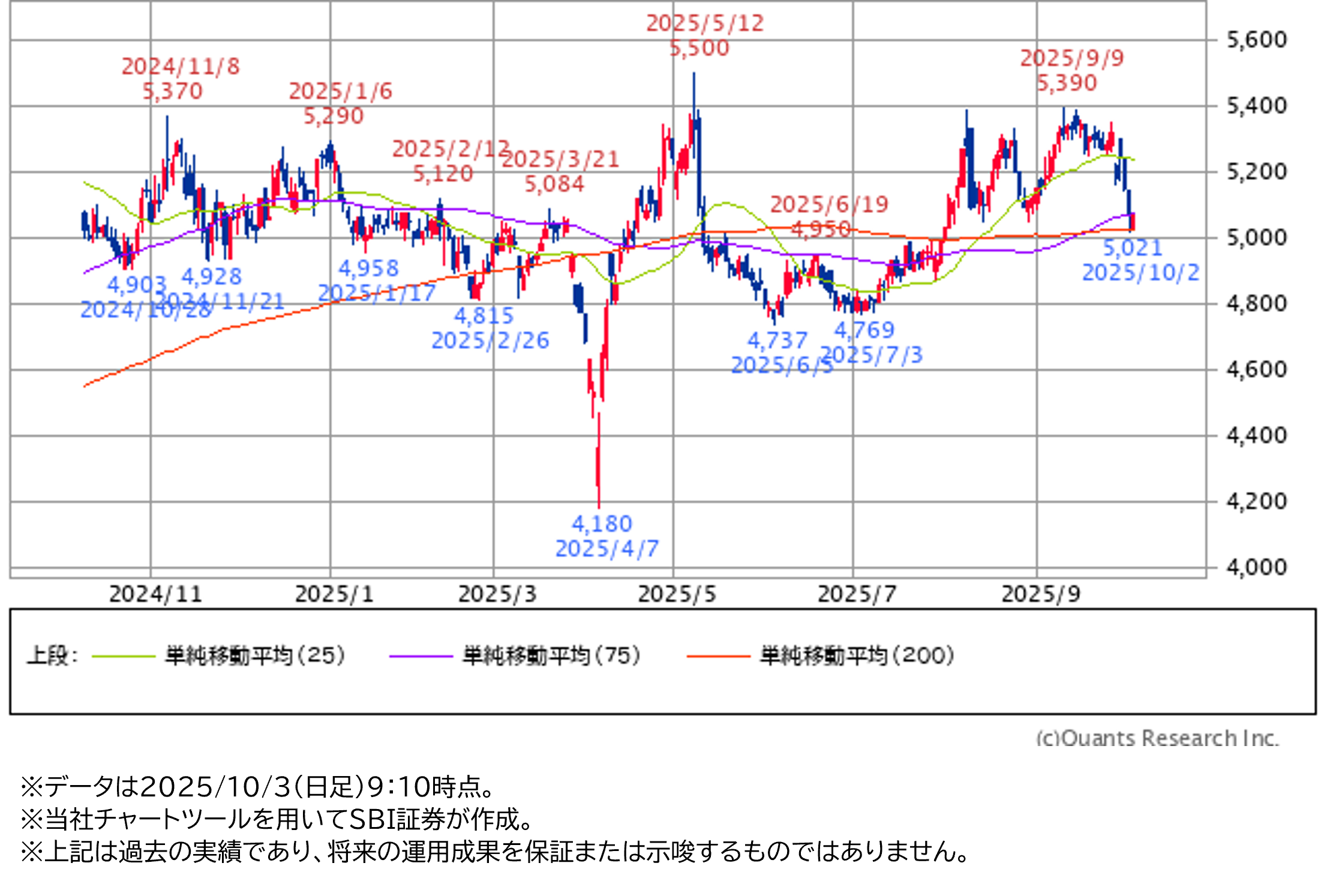 日経平均株価は9/25(木)に終値ベースで過去最高値を更新後、若干の調整こそありましたが、10/2(木)の終値は44,936円と依然として高値水準を維持しています。10/4(土)に自民党総裁選の投開票という重要イベントを前に、東京株式市場では様子見ムードが漂っています。