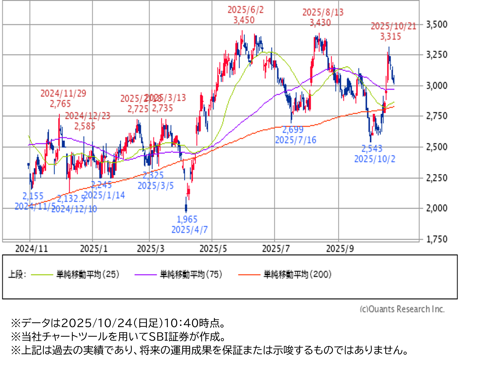 ◎株価は年初来高値3,450円(6月2日)付近で押し返される展開が続いていますが、サイバーセキュリティ強化は高市政権の重要課題でもあり、「国策銘柄」として話題性の面からも再評価されれば、好業績を背景に高値突破も期待されます。