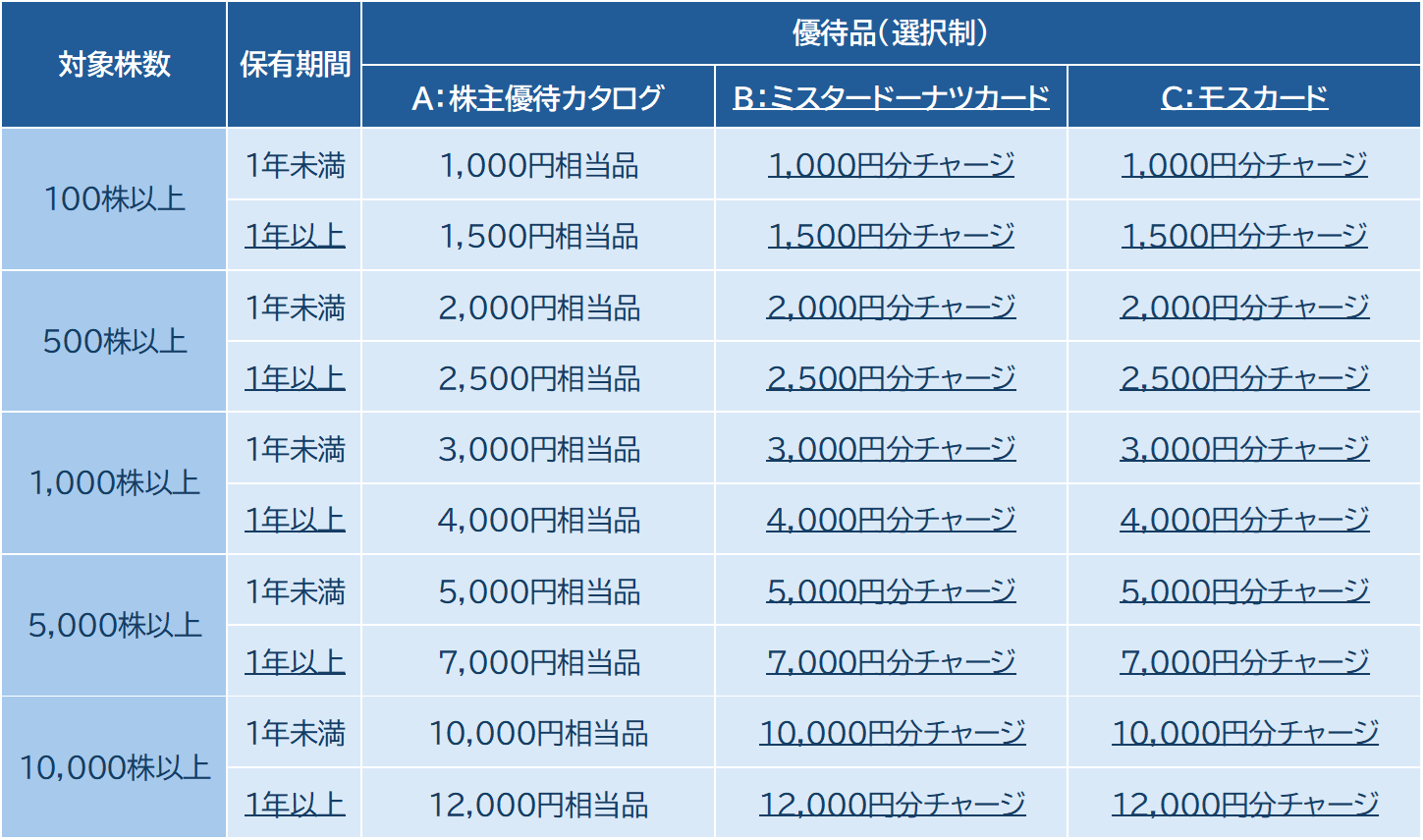 今回の変更により、優待品は従来の「株主優待カタログ」に加え、「ミスタードーナツカード(チャージ済みプリペイドカード)」、「モスカード(チャージ済みプリペイドカード)」から選べるようになりました。