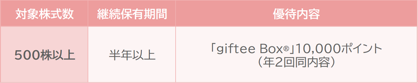 500株以上を半年以上保有することで、年に2回「giftee Box®」10,000ポイントがもらえます🪙