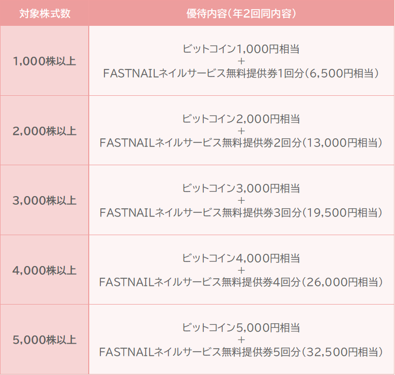 現行制度でもらえていた「FASTNAIL優待割引券(2,000円相当)」が「FASTNAILネイルサービス無料提供券(6,500円相当)」に変更されました。