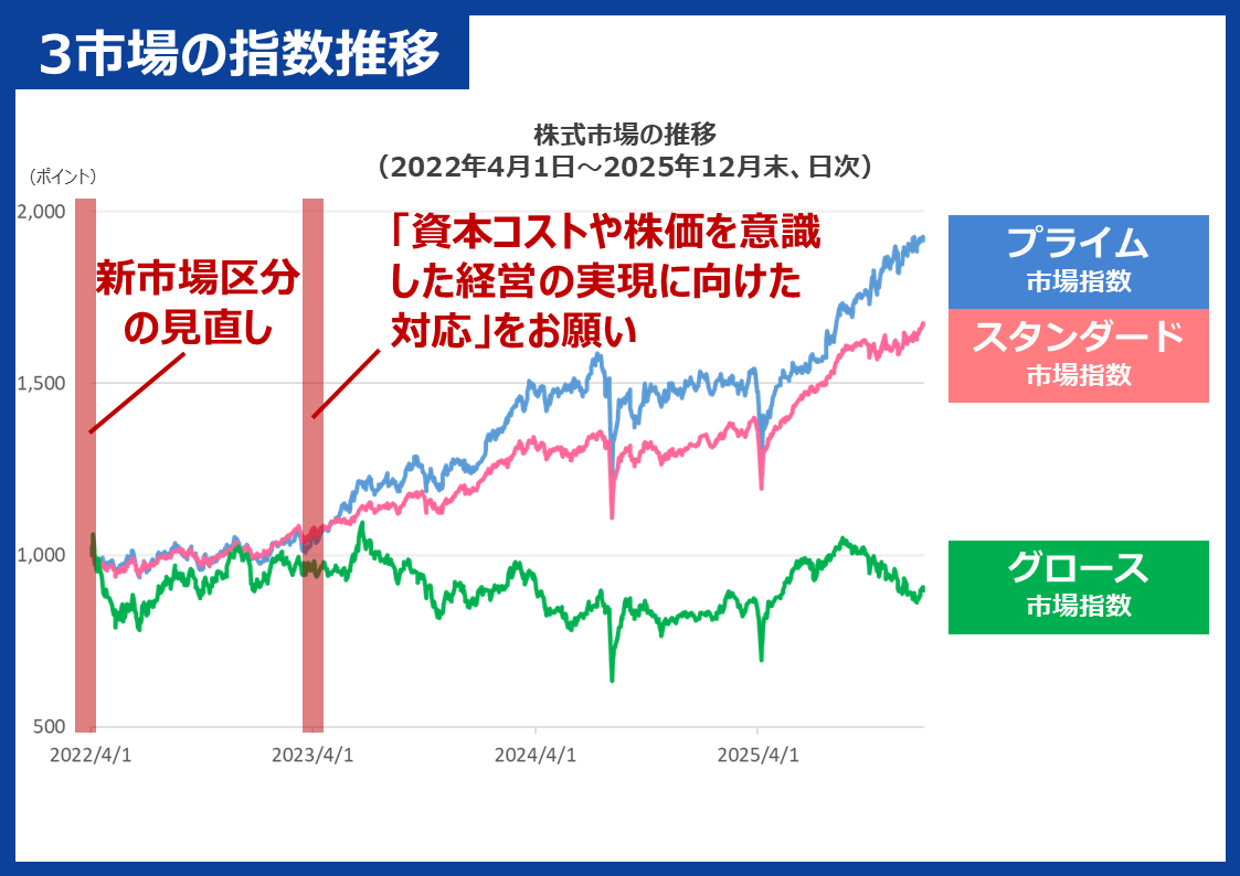 新市場区分の見直しが行われた2022年4月を起点に、プライム・スタンダード・グロースの3市場の指数を比較したグラフです。