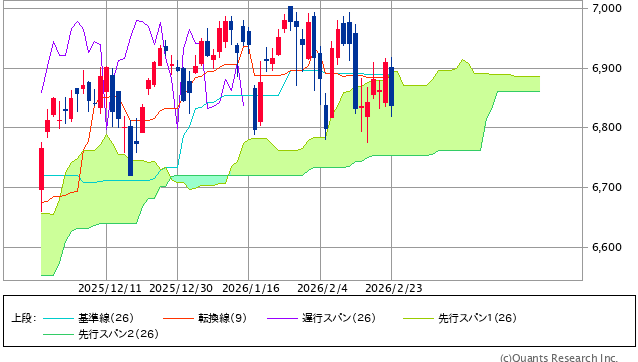 引き続き上値が重く、「雲」の上限に絡んで推移しています。「雲」が下値支持帯となるか注目です。