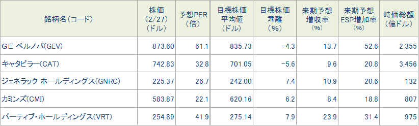 | 買付 | GE ベルノバ(GEV) | 873.60ドル | 61.1 | 【全部門の受注が好調】 ・旧GEの分割で2024年に誕生した世界有数の発電設備メーカーです。2025年12月期の売上構成比は、発電機が52%、風力発電24%、送配電・変電設備が25%、その他-1%となっています。 ・10-12月期の受注は全体で前年同期比65%増で、発電機が同77%、風力発電が同55%増、送配電・変電設備が同54%と、全部門が好調です。10-12月期の業績好調を受けて、2026年の売上高見通しを従来の410億~420億ドルから440億~450億ドルに引き上げました。 | |