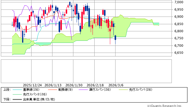 イラン攻撃が長期化する可能性から原油価格が急騰、経済や株式相場に対する悪影響が懸念されて、下値支持帯として期待された「雲」を下抜けました。移動平均線は6,838ポイントの100日移動平均線を割り込み、次の下支えと期待されるのは6,582ポイントにある200日移動平均線です。