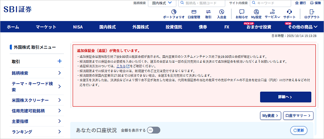 追証の発生状況や追証金額、解消期限の確認は、外国株式トップや米国株アプリの画面内に表示されるメッセージで確認できます。
