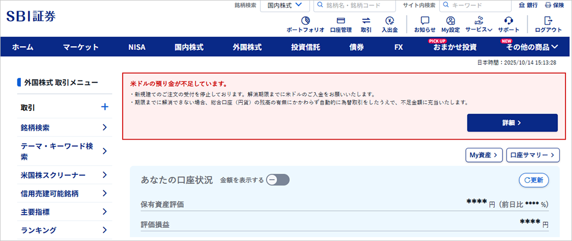 預り金不足が発生した場合、不足している米ドルを期限内に入金する必要があります。解消の期限は、原因となった取引の国内受渡日の17:30です。