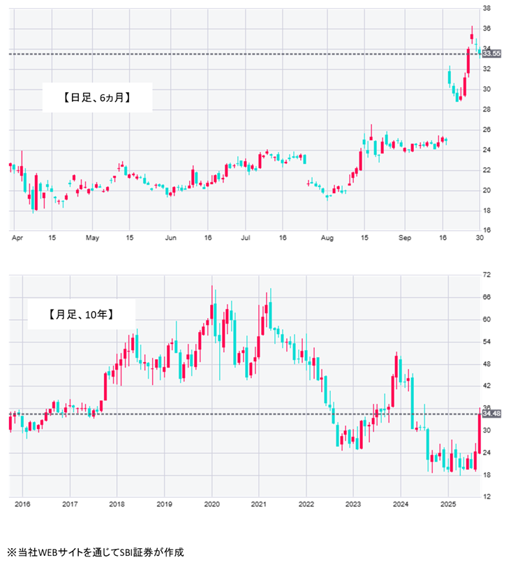 図表2 インテルの株価チャート(日足6ヵ月、月足10年)