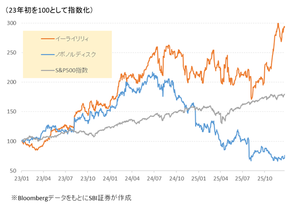 肥満治療薬の銘柄は、ここ1年半でイーライリリィとノボノルディスクに大きな格差が生じました。直近で動きの出た経口タイプの肥満治療薬が競合状況を変えるか注目です。