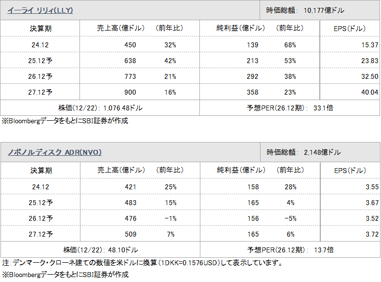 12/22(月)に「ウゴービ」経口錠がFDAに承認されました。経口のGLP-1タイプ肥満治療薬がFDAに承認されたのは初めてのケースで、同社は2026年初から販売を始めるとしています。イーライリリィも開発中の経口肥満治療薬「オルフォルグリプロン」(中外製薬から導入したもの)を、2025年中のFDA申請と来年3月までの承認を見込んでいます。