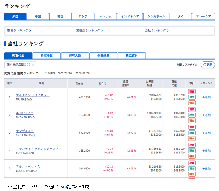 対象期間を2026/02/16 ~ 2026/02/20としたランキングから上位の5銘柄をご紹介いたします。